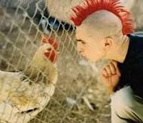 a um punk de cabelos compridos, com crista parecida com um galo,